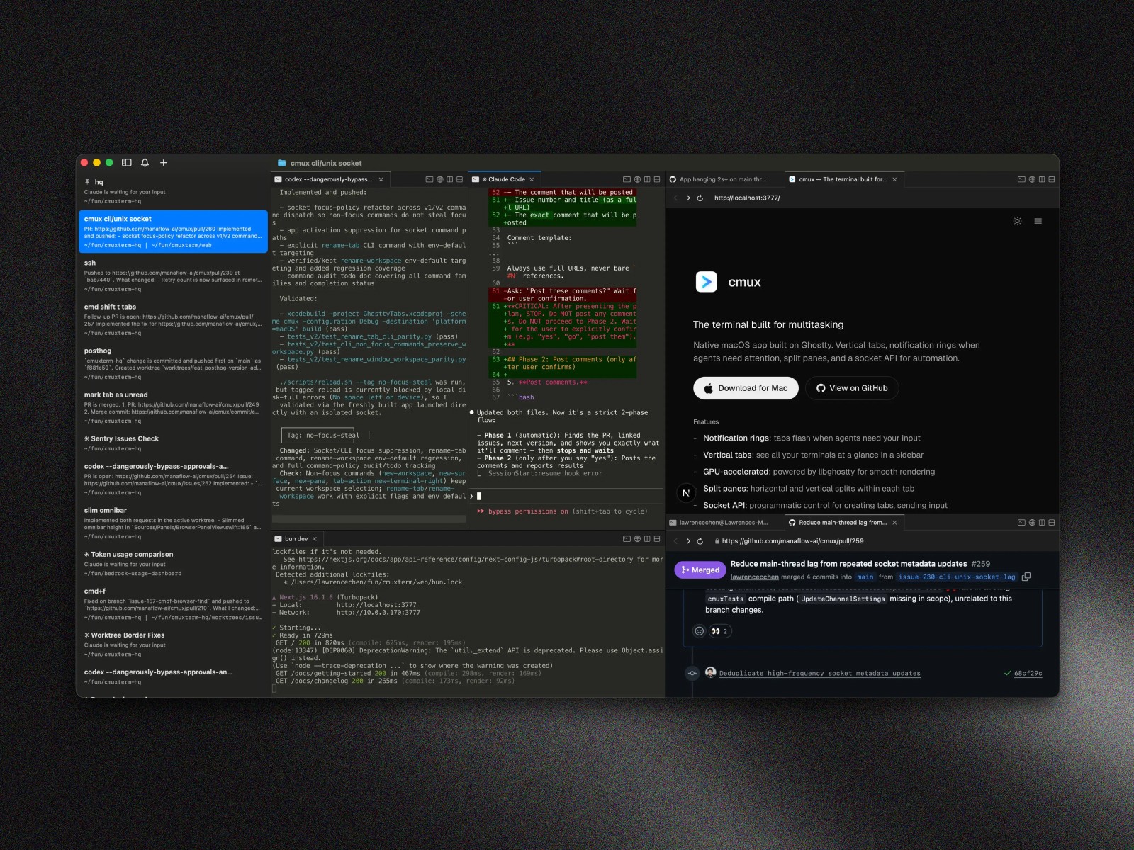 A terminal app built for macOS. Vertical tabs, notification rings when agents need attention, split panes, and a socket API for automation.