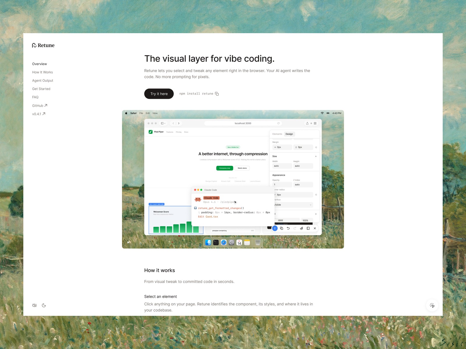Lets you select and tweak any element right in the browser. Your AI agent writes the code. No more prompting for pixels.